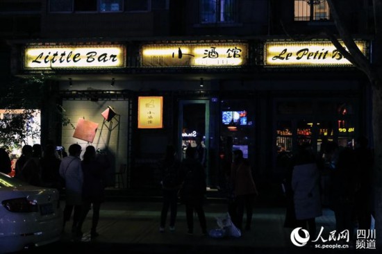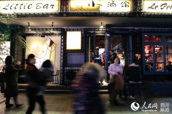 夜幕降临,不少来往的游客在成都“小酒馆”门口拍照留念,甚至还有外地游客专门慕名而来。(朱虹 摄)