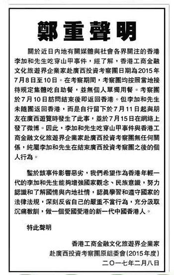 声明称,该考察团访问日期为2015年7月8日至10日,在考察期间,考察团均按照当地接待规定集体吃自助餐,并无个人单独用餐。考察团于7月10日访问结束后即返回香港。但李加和未随团返回香港,而是自行留下于7月11日起与朋友在广西游览时发生了此事,并于7月15日在网络上发了微博。